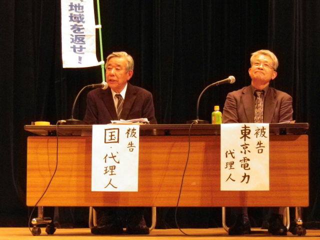 これまでの期日では、弁護団が模擬裁判として並行して行われている裁判の様子の再現(?)を試みておりましたが、今回から原告団の企画として「原告団小劇場」が始まりました。原告団小劇場では、原告が原告(被害者)役、裁判官役、国・東電役を演じ、原告役が自らの被害を国・東電に訴えるというものです。原告自ら被害を語り、これまでの弁護団の模擬裁判とは違った、生々しい訴えが心に響きました。国・東電役の名演技も含めて、会場では何度も笑いの渦が巻き起こりました。