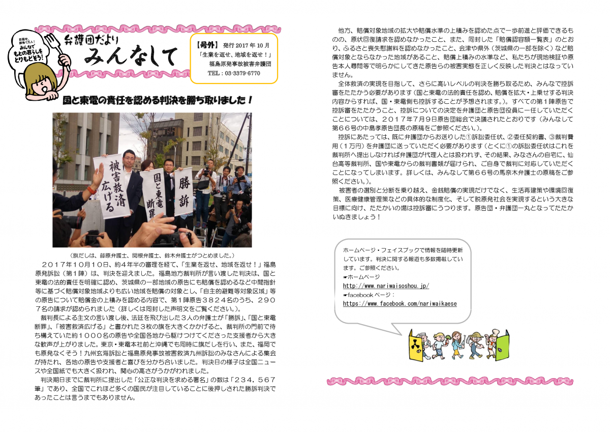 弁護団だより「みんなして」 号外 弁護団だより「みんなして」 号外 みんなして 号外 弁護団だより「みんなして」 号外 発行:2017年10月 「生業を返せ、地域を返せ!」福島原発事故被害弁護団 TEL:03-3379-6770